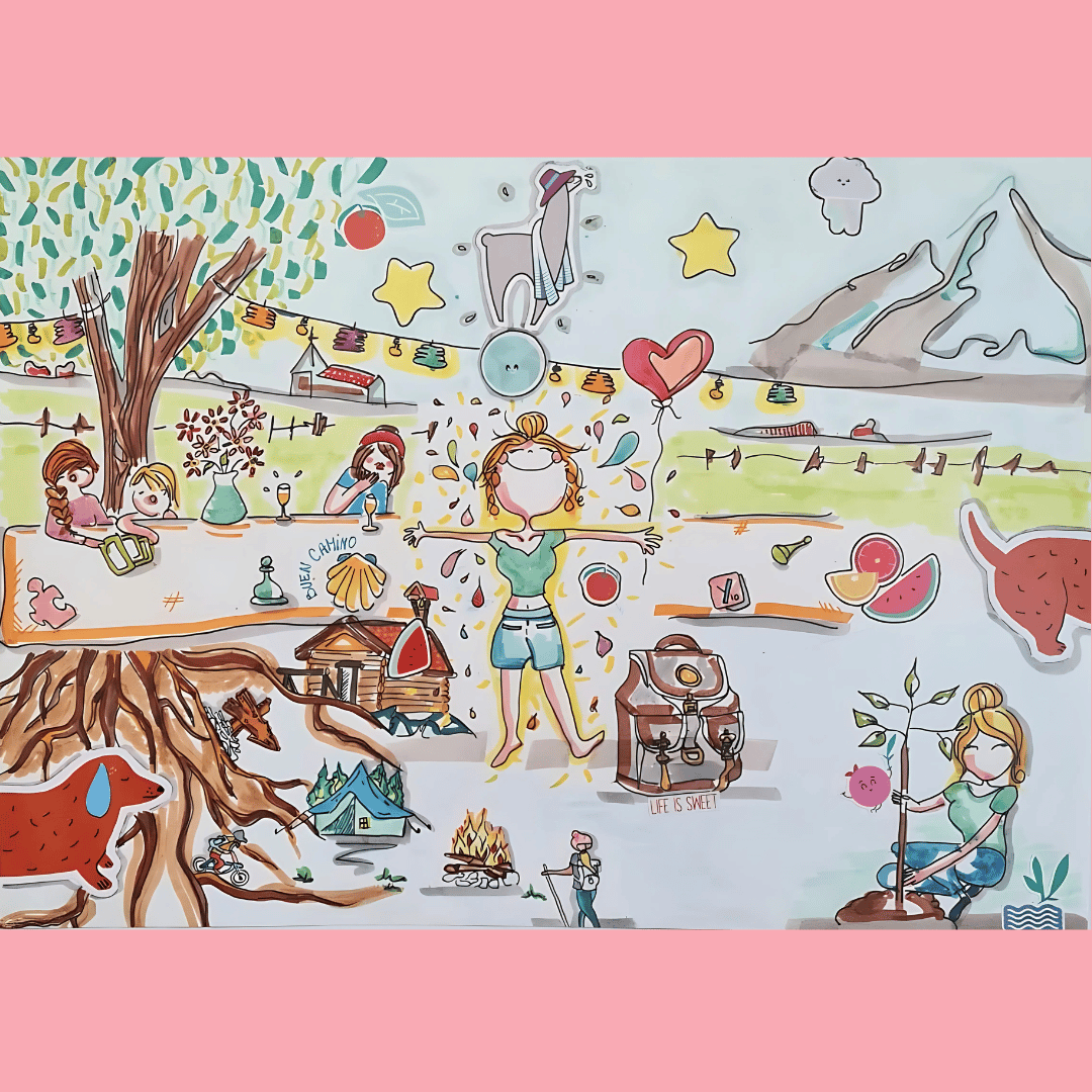 I see life itself as a game: full of challenges, surprises, and magical moments. That is the spirit I bring into everything I create: poetic audio journeys, creative workshops, playful collective games… and offers like Draw Me a Dream, where I transform people’s deepest desires into illustrated talismans, or the very first pop-up coliving retreat I am preparing, where community and dreams intertwine.